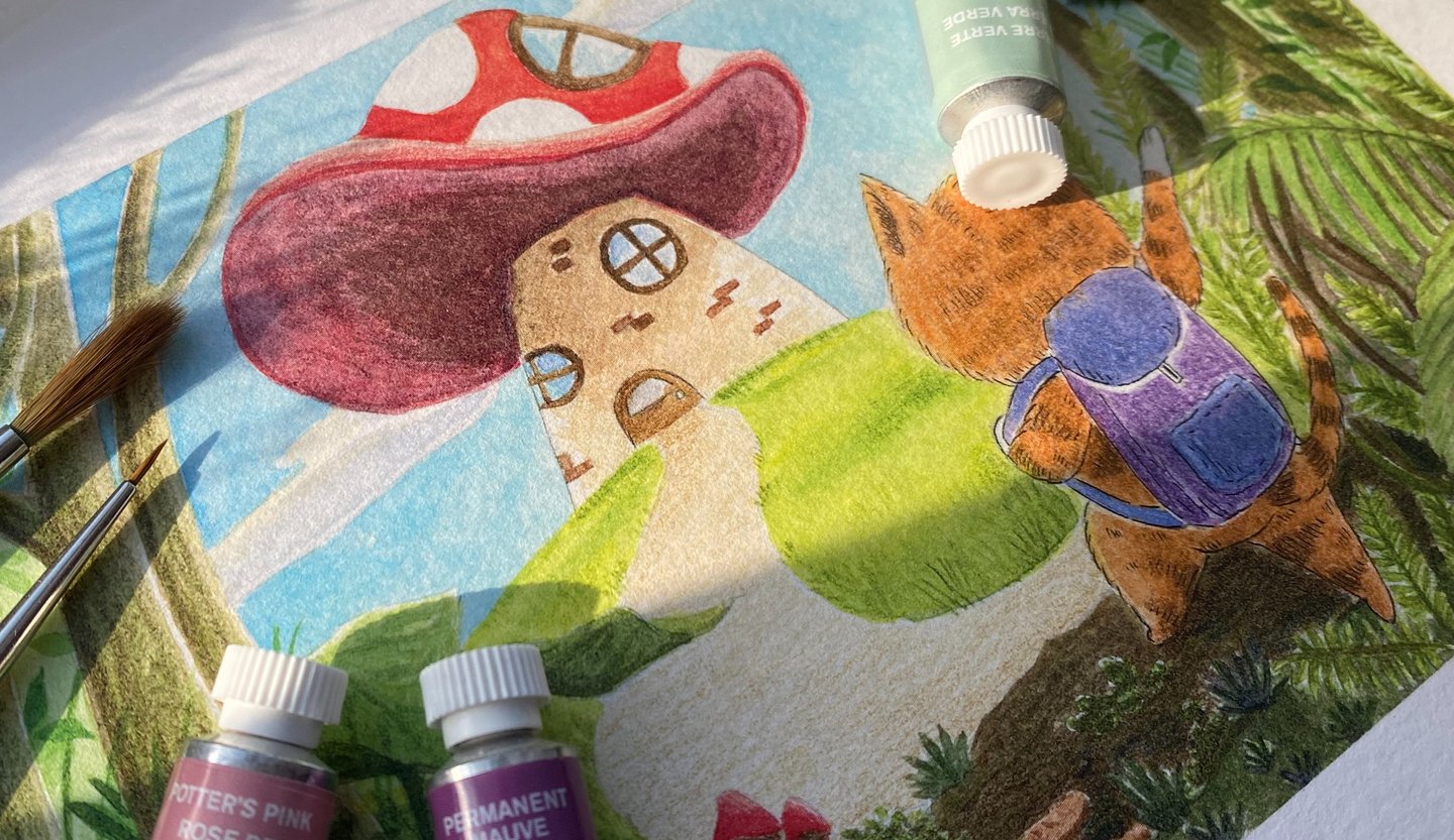 I enjoy combining bright colours, expressive characters, and thoughtful details to bring warmth and storytelling into each illustration. I hope to bring imagination and joy to young readers and let adults enjoy the tenderness and comfort of life. Therefore, my inspiration references not only come from real-life photos, but also from various colour palette samples and different imaginative artworks. My personal observations and past experience are part of the creative process as well. It begins with sketches and rough ideas that grow into detailed scenes. After the monotone pencil sketch is finished, I transfer the sketch onto watercolour paper and start the colouring process. I usually finish the painting by adding texture and details with coloured pencils and ink.