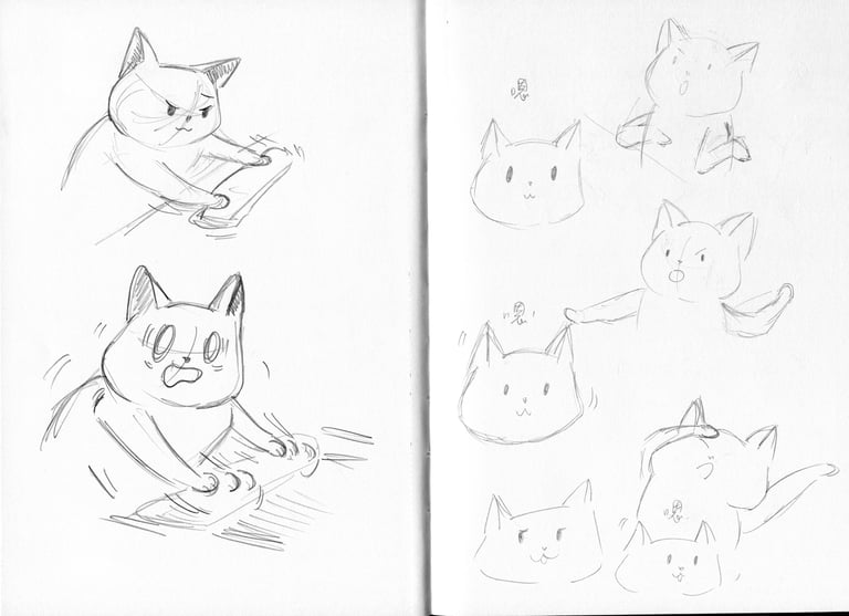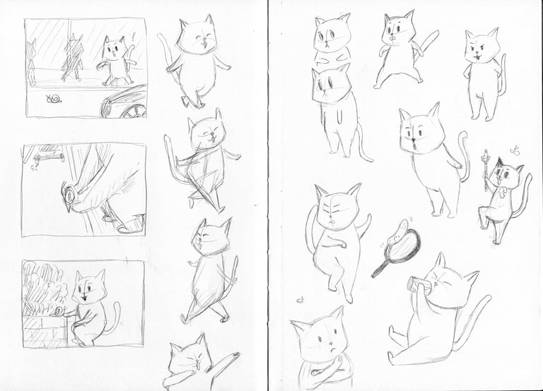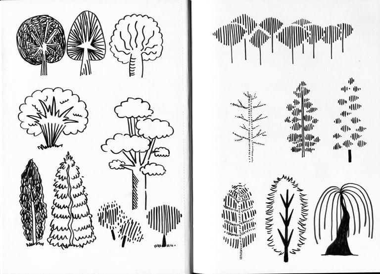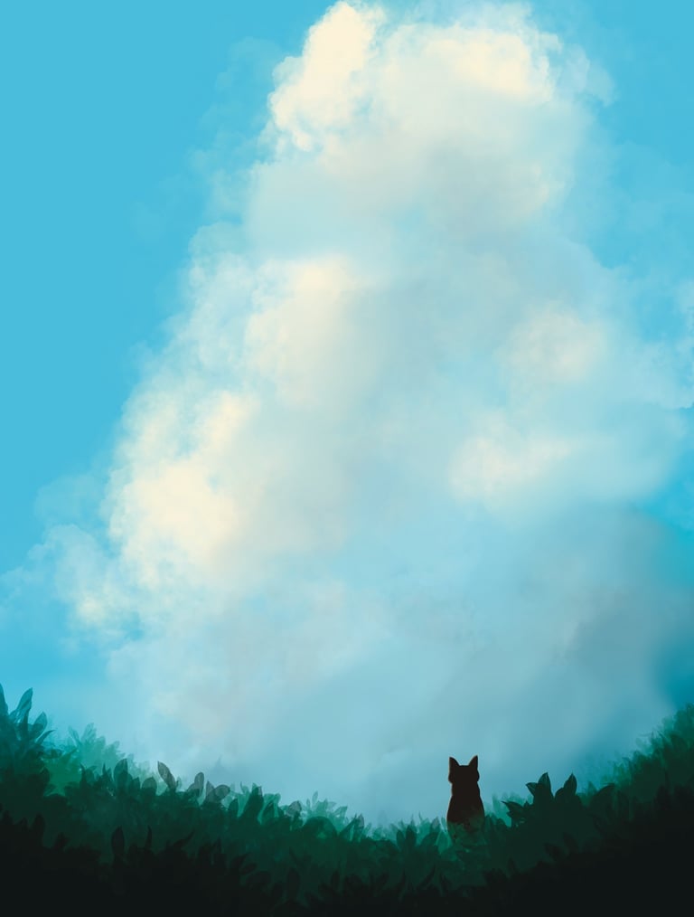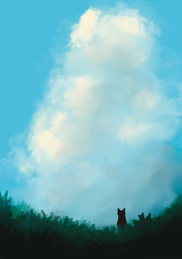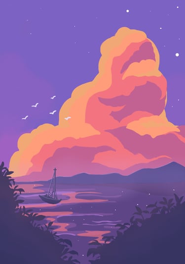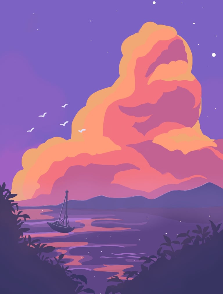 I practice drawing backgrounds digitally to experiment with different colour palettes, from orange sunsets to bright blue skies in summer.